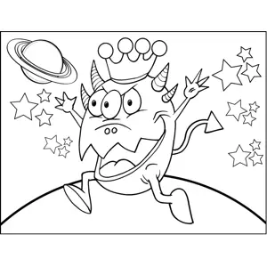 Monster with Crown Printable Coloring Page, free to download and print. The alien monster in this printable space coloring page has three eyes, four horns and is wearing a crown as it runs across the planet.