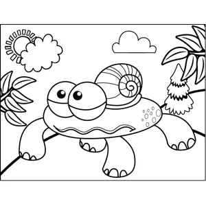 Snail Monster Printable Coloring Page, free to download and print. A worried creature with four legs and snail shell crawls through ferns in this printable monster coloring page.