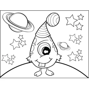Spotted Cyclops Printable Coloring Page, free to download and print. A happy, spotted Cyclops stands in space wearing a silly striped hat in this printable monster coloring page for kids who like outer space.