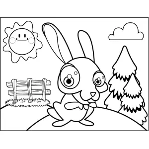 Crouching Bunny Printable Coloring Page, free to download and print. A cute little bunny crouches on a hill near a fence in this printable coloring page about farm animals.
