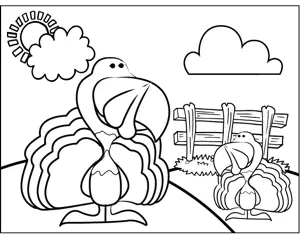 Cute Turkeys Printable Coloring Page, free to download and print. Use this printable bird coloring page of two turkeys is great for animal lovers or Thanksgiving activities.