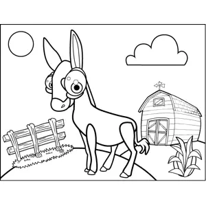 Happy Mule Printable Coloring Page, free to download and print. A cute, happy little mule stands near a barn and a fence in this printable farm coloring page.
