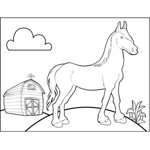 Horse by Barn Printable Coloring Page, free to download and print. This printable farm coloring page features a proud horse standing on a hill near a barn.