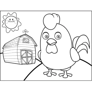 Rooster by Barn Printable Coloring Page, free to download and print. This printable farm coloring page features a cute little rooster standing near a barn in a field.