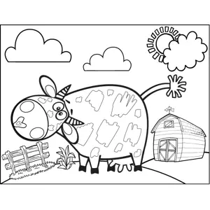 Silly Spotted Cow Printable Coloring Page, free to download and print. This printable farm coloring page features a silly, spotted cow making faces near a fence and barn.