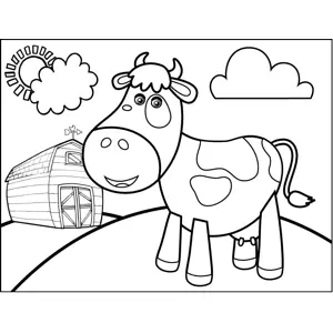 Standing Cow Printable Coloring Page, free to download and print. Learn about farm animals with this printable coloring page of a spotted cow standing near a barn.
