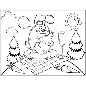 Bunny and Bottle Printable Coloring Page, free to download and print. Set up as a picnic with a tablecloth, utensils and lots of carrots, this printable animal coloring page has a bunny hugging a bottle.