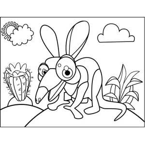 Cute Baby Kangaroo Printable Coloring Page, free to download and print. Set against a desert background with cacti and plants, this printable animal coloring page features a cute, hopping kangaroo.