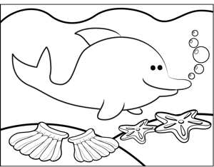 Cute Dolphin Printable Coloring Page, free to download and print. Great for ocean activities and marine biology fun, this printable coloring page features a happy dolphin blowing bubbles at the bottom of the sea.