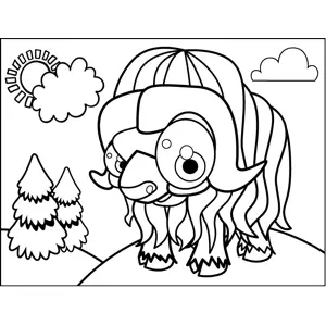 Cute Yak Printable Coloring Page, free to download and print. The cute yak in this printable animal coloring page has big eyes, curved horns and long, shaggy fur.