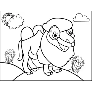 Happy Camel Printable Coloring Page, free to download and print. Young artists will enjoy filling this printable animal coloring page of a camel with two humps walking in the desert.
