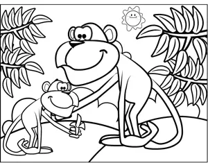 Monkeys Eating a Banana Printable Coloring Page, free to download and print. This printable animal coloring page shows two cute monkeys eating a banana.