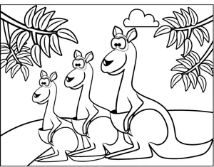 Three Kangaroos Printable Coloring Page, free to download and print. There are three happy kangaroos standing together under the trees in this printable animal coloring page.