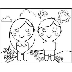 Couple at the Beach Printable Coloring Page, free to download and print. Dress in a bikini and swim trunks, the couple in this printable person coloring page are ready for a day of swimming at the beach.