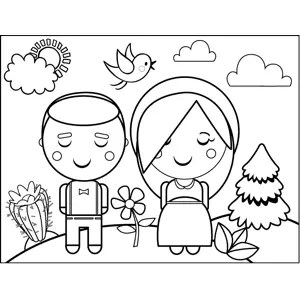 Couple in Field Printable Coloring Page, free to download and print. Flowers, trees, birds and a cactus make up the setting for this printable coloring page of a couple standing in a field.