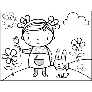Girl with Pet Bunny Printable Coloring Page, free to download and print. Great for art activities, this printable coloring page features a cute little girl picking flowers with her pet bunny.