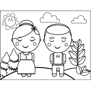 Happy Couple Printable Coloring Page, free to download and print. The couple standing in the forested hills of this printable coloring page looks happy and romantic together.