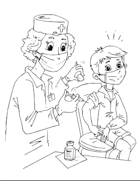 Kid Getting Vaccine Printable Coloring Page, free to download and print. A nurse gives a little boy a shot on this medical coloring page that encourages receiving necessary childhood vaccines.