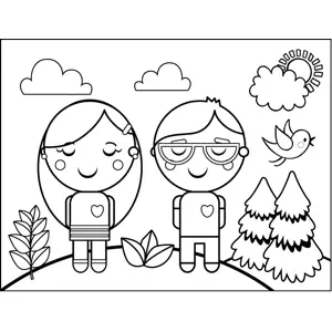 Teenagers in Love Printable Coloring Page, free to download and print. The two teenagers in this printable couple coloring are dressed alike and love each other and nature.