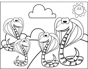 Cobras Printable Coloring Page, free to download and print. A family of four cobras sit coiled and happy in the sun in this printable coloring page for children.