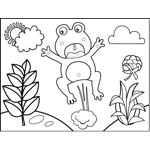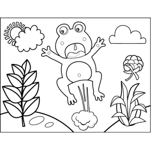 Frightened Leaping Frog Printable Coloring Page, free to download and print. Something has frightened the frog in this printable amphibian coloring page, because he is leaping in the air and yelling.