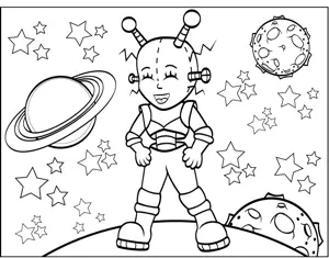 Alien Space Girl Printable Coloring Page, free to download and print. An alien space girl stands on a planet in outer space in this printable coloring page.