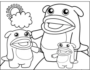 Big Mouth Monsters Printable Coloring Page, free to download and print. This fantastical coloring page features a wide-mouthed monster and its two babies on a sunny hill.