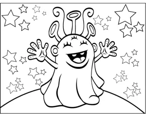 Happy Alien Printable Coloring Page, free to download and print. A happy alien laughs on the surface of a planet amongst the stars in this printable outer space coloring page.