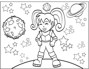 Space Girl Printable Coloring Page, free to download and print. Dressed in a space suit and pigtails, the astronaut girl in this printable outer space coloring page laughs among the planets and stars.