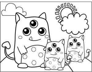Three Eyed Monsters Printable Coloring Page, free to download and print. The parent and baby monsters in this printable fantasy coloring page have spots and three eyes each.