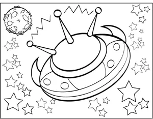 UFO and Planet Printable Coloring Page, free to download and print. A UFO blasts through space, stars and planets in this printable coloring page for kids.