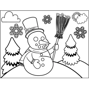 Snowman with Broomstick Printable Coloring Page, free to download and print. Great for holiday art activities, this printable holiday coloring page shows a snowman dressed in a top hat and holding a broom.