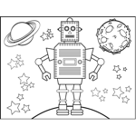 Robot and Stars Printable Coloring Page, free to download and print. There is a happy metal robot standing on a planet and surrounded by stars in this printable outer space coloring page for kids.
