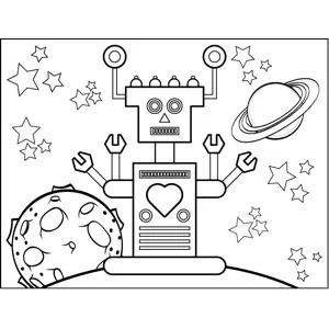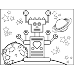 Robot in Space Printable Coloring Page, free to download and print. Kids who like sci-fi will love this printable outer space coloring page of a robot with four metal arms and a heart on its chest.