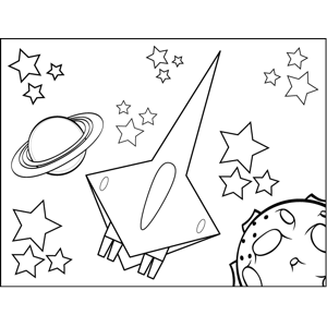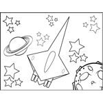 Stars and Spaceship Printable Coloring Page, free to download and print. Set against a background of stars, planets and asteroids, this printable coloring page shows a spaceship with a long, pointed nose.