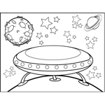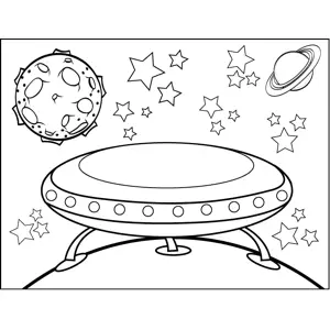 UFO Landing on Planet Printable Coloring Page, free to download and print. The UFO landing on an alien planet has a series of lights around the flying saucer in this printable space coloring page.