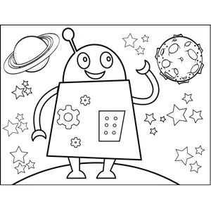 Waving Robot Printable Coloring Page, free to download and print. A happy robot covered in gears and cogs smiles and waves in this printable space coloring page for young artists.