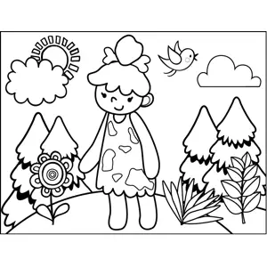 Cavewoman with Flowers Printable Coloring Page, free to download and print. This printable Stone Age coloring page features a pretty Neanderthal cavewoman with a bone through her hair walking through a field of flowers and trees.